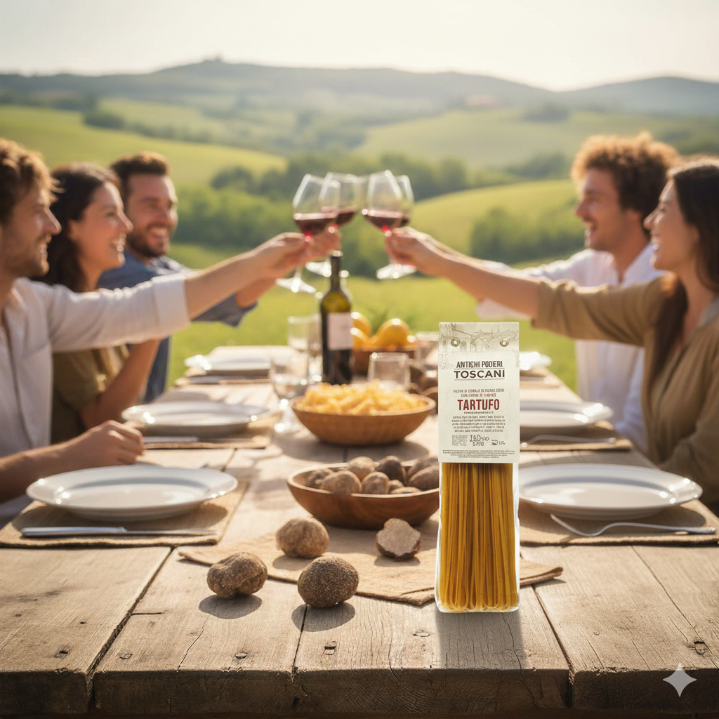 Ten wyjątkowy makaron rzemieślniczy (PRODUKT ARTIGIANALE) powstaje w rodzinnej fabryce Antichi Poderi Toscani, gdzie do semoliny z pszenicy durum dodaje się zarodki pszenicy 🌾 i trufle letnie (1,29%) 🍄.