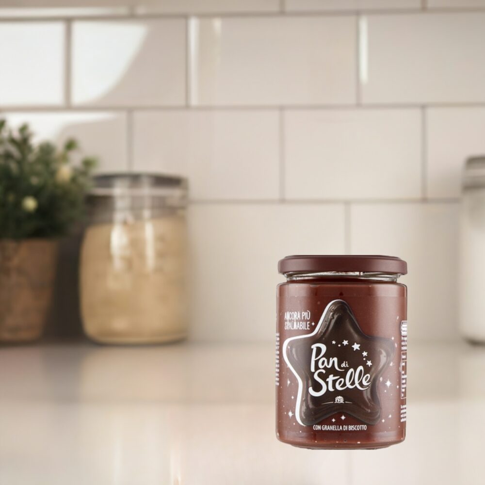 Rozkoszuj się niebiańskim smakiem kremu Pan di Stelle – wyjątkowego połączenia kremowej czekolady, delikatnych orzechów laskowych i chrupiących kawałków kultowych ciasteczek Pan di Stelle. 🍪