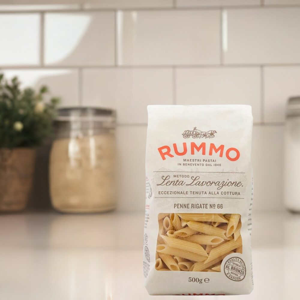 🇮🇹 Penne Rigate Rummo – włoski makaron z pszenicy durum, stworzony metodą Lenta Lavorazione. Idealny do sosów, zawsze al dente! 🍝✨