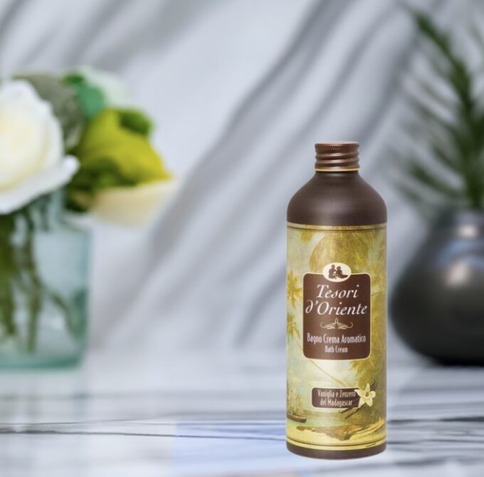 Płyn do kąpieli Tesori d'Oriente łączy ciepłą wanilię z imbirem, tworząc unikalne doznanie zapachowe i pielęgnacyjne już podczas kąpieli.