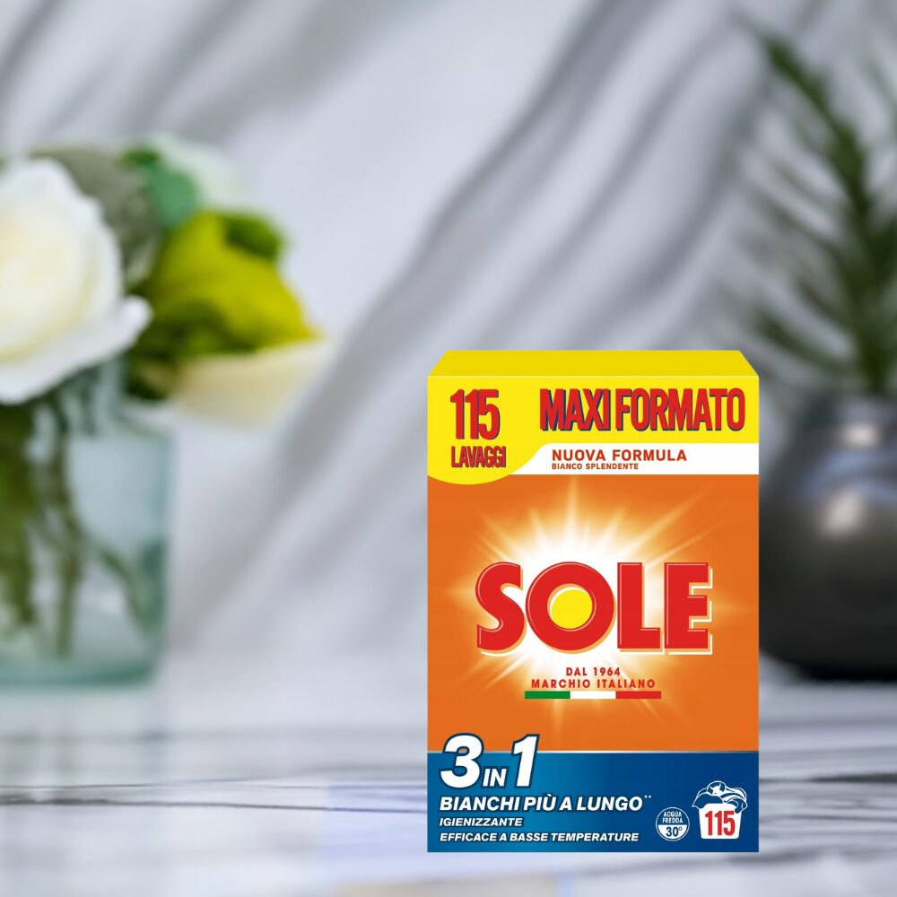 🌞 Proszek SOLE 3w1 z formułą Bianco Splendente – aż 115 prań, czystość i biel na długo! 🇮🇹