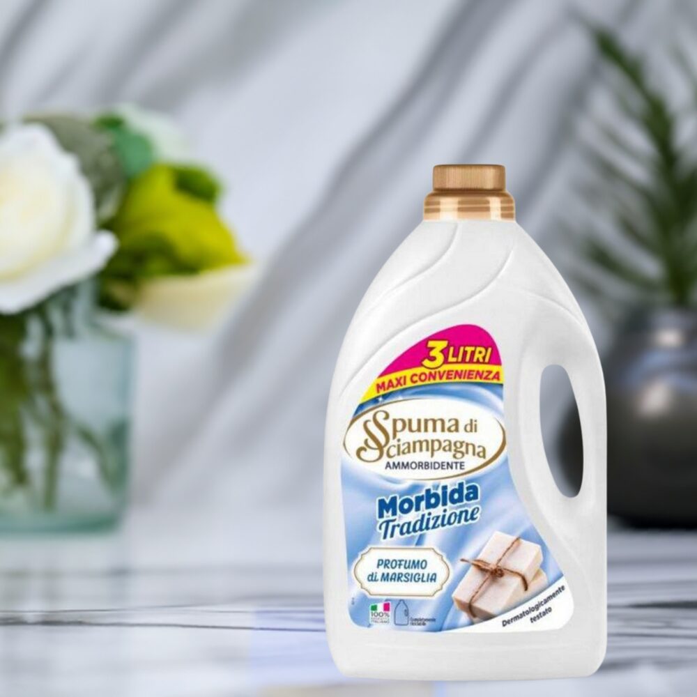 Pozwól swoim ubraniom rozkwitnąć dzięki Spuma di Sciampagna Ammorbidente Marsiglia – płynowi do płukania o tradycyjnym zapachu mydła marsylskiego. Idealny do codziennej pielęgnacji tkanin całej rodziny!