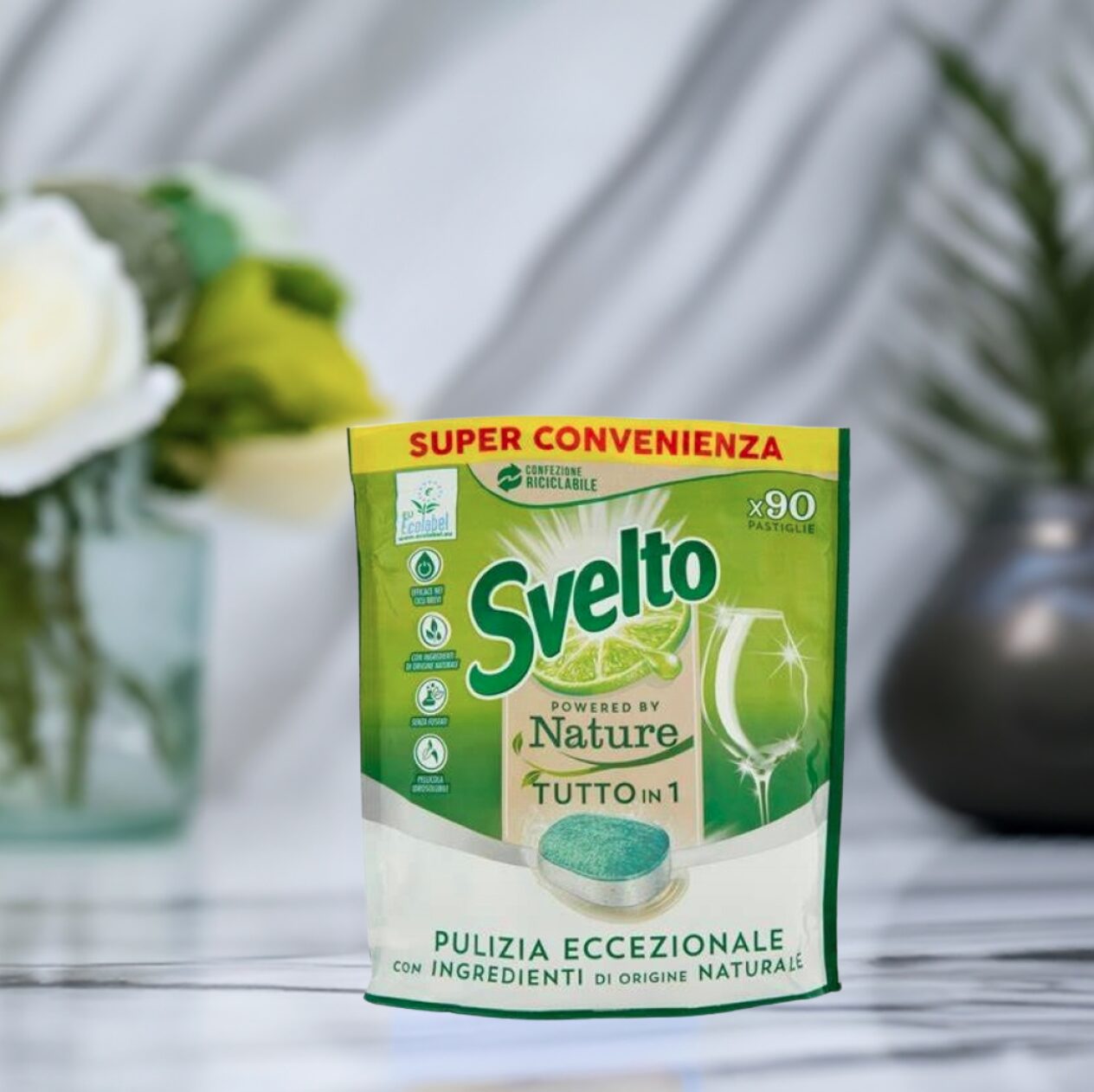 Poznaj Svelto Powered by Nature – ekologiczne tabletki do zmywarki, które łączą włoską skuteczność z troską o środowisko. Dzięki naturalnym składnikom i folii rozpuszczalnej w wodzie zyskujesz doskonałą czystość naczyń i minimalizujesz wpływ na planetę 🌍.
